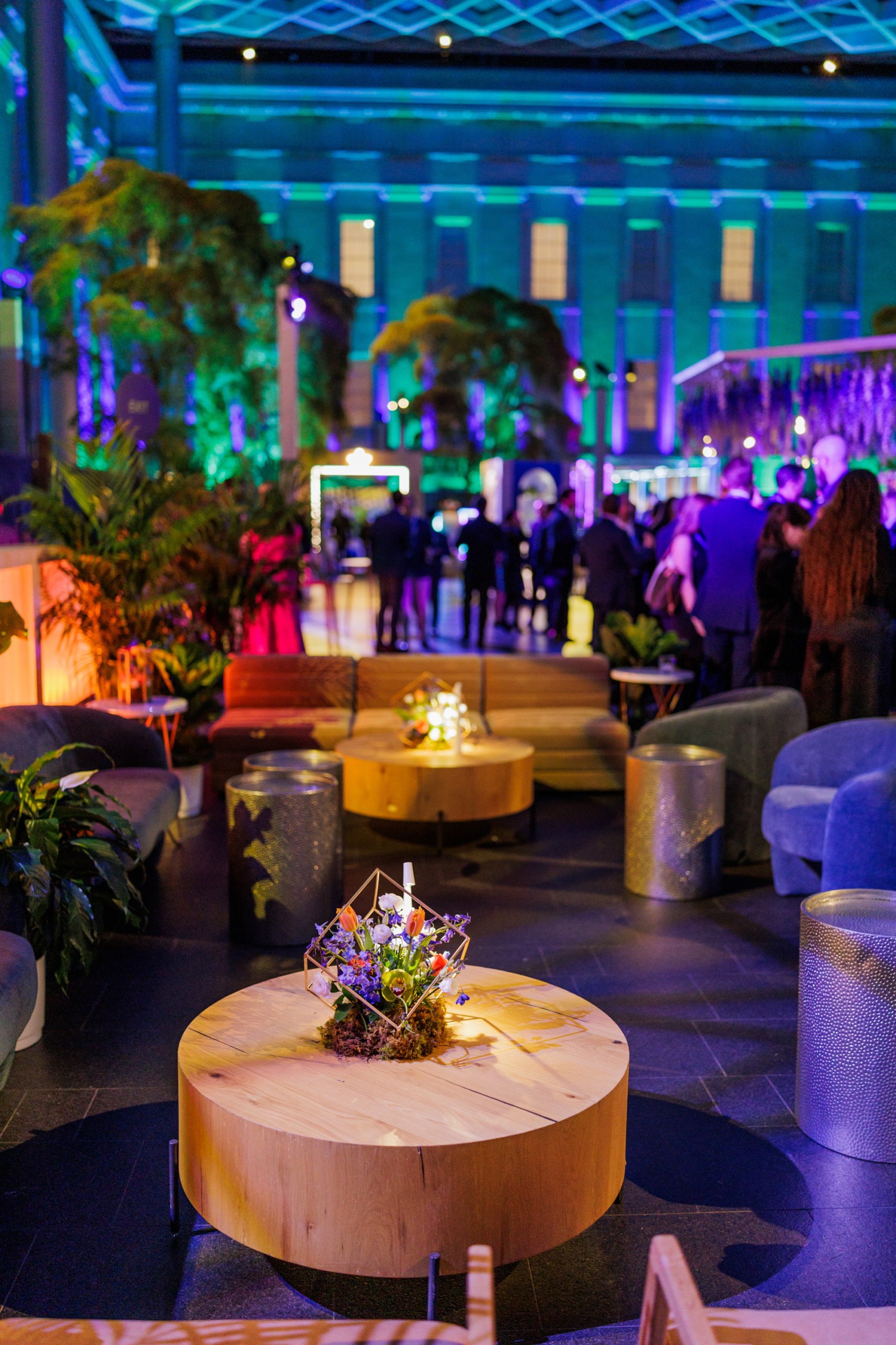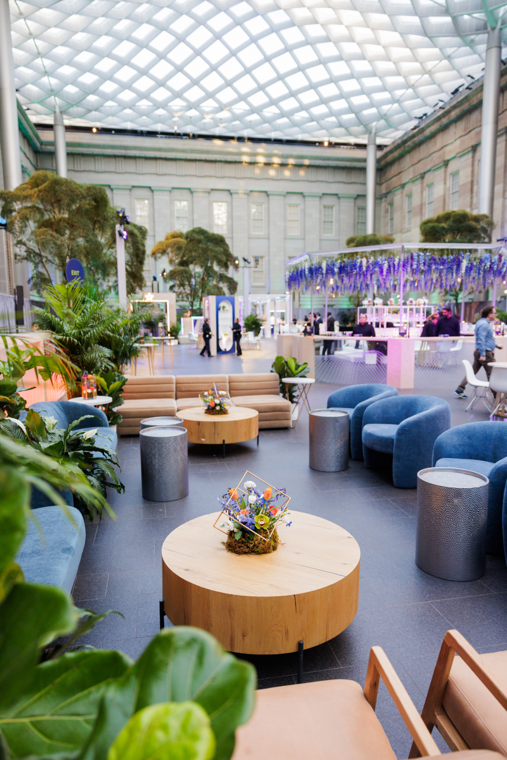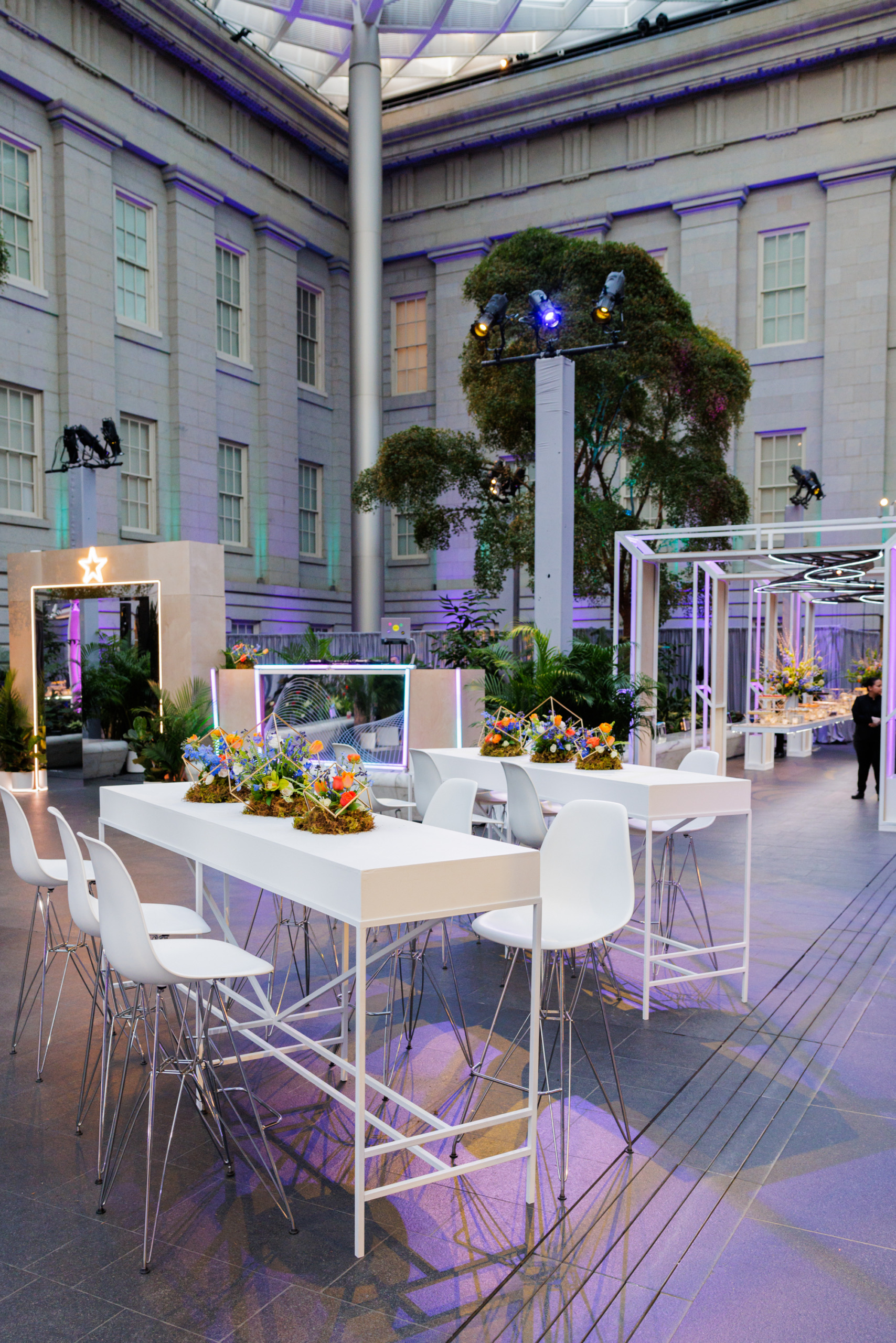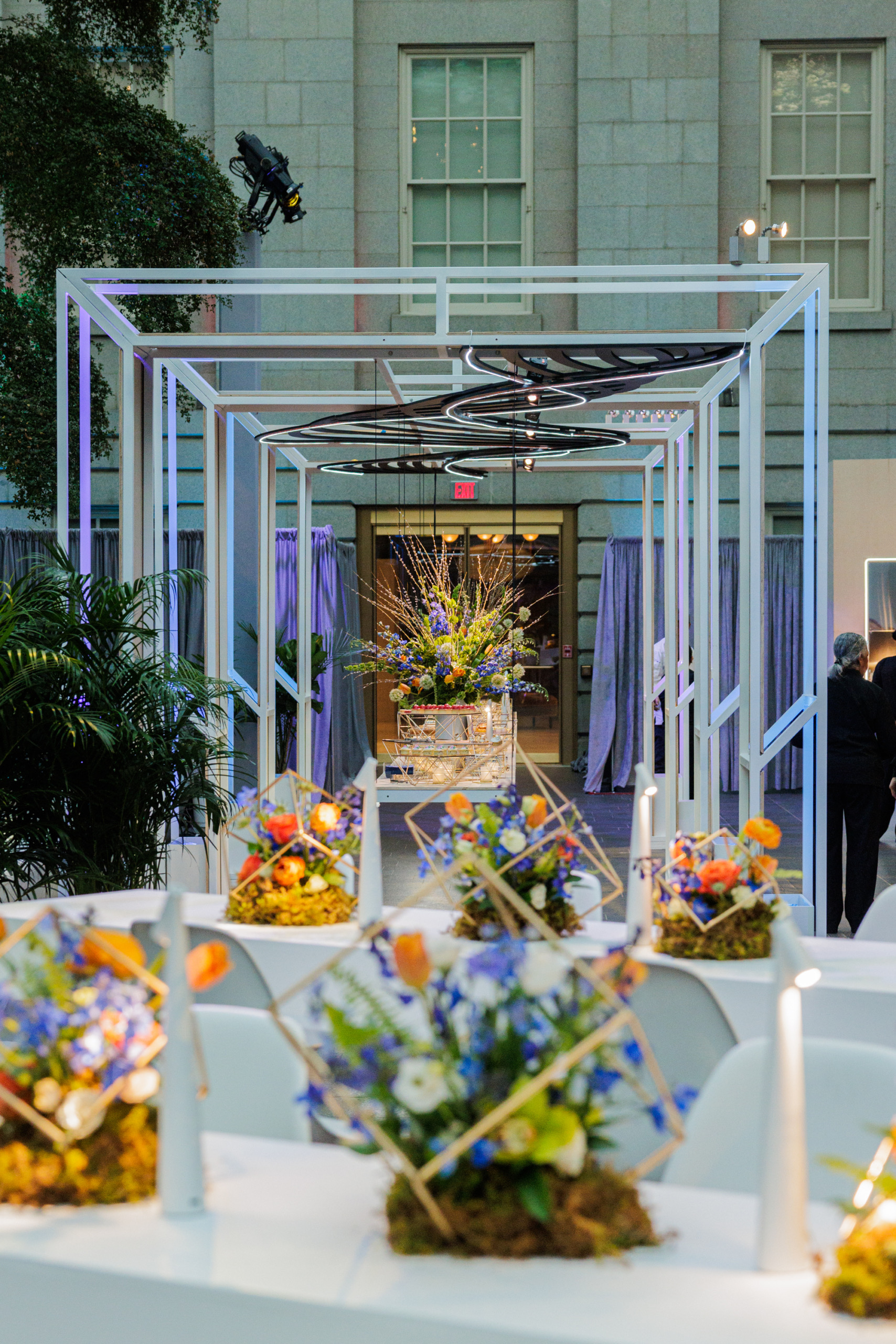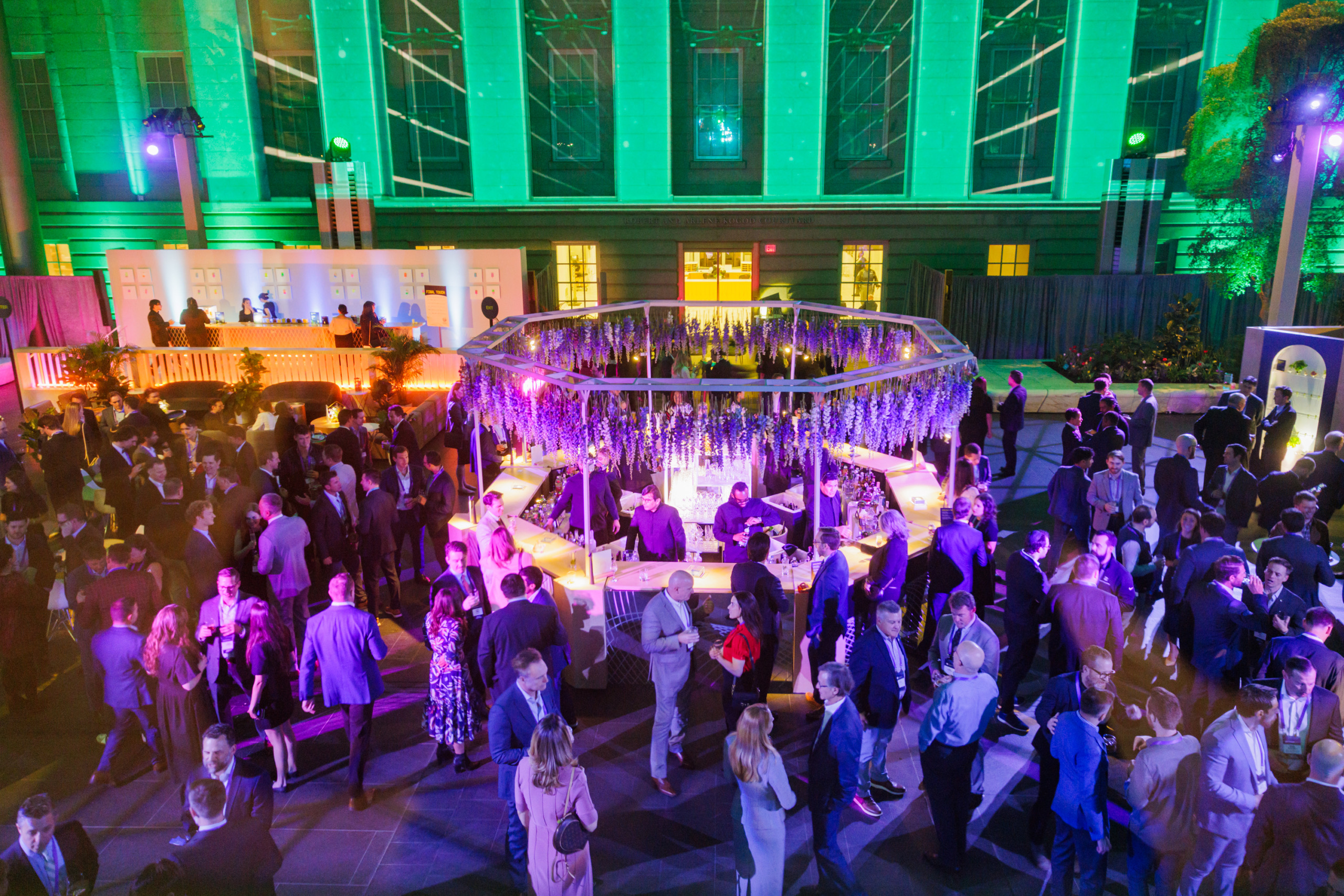 The Kogod Courtyard was transformed into a sleek, modern reception space featuring edgy culinary moments and bold design. Guests mingled around a 30-foot floating buffet, created custom popsicles, and sampled bespoke champagne flavors, while a hexagon-shaped mirrored bar with a lush floral installation overhead anchored the evening in style.
