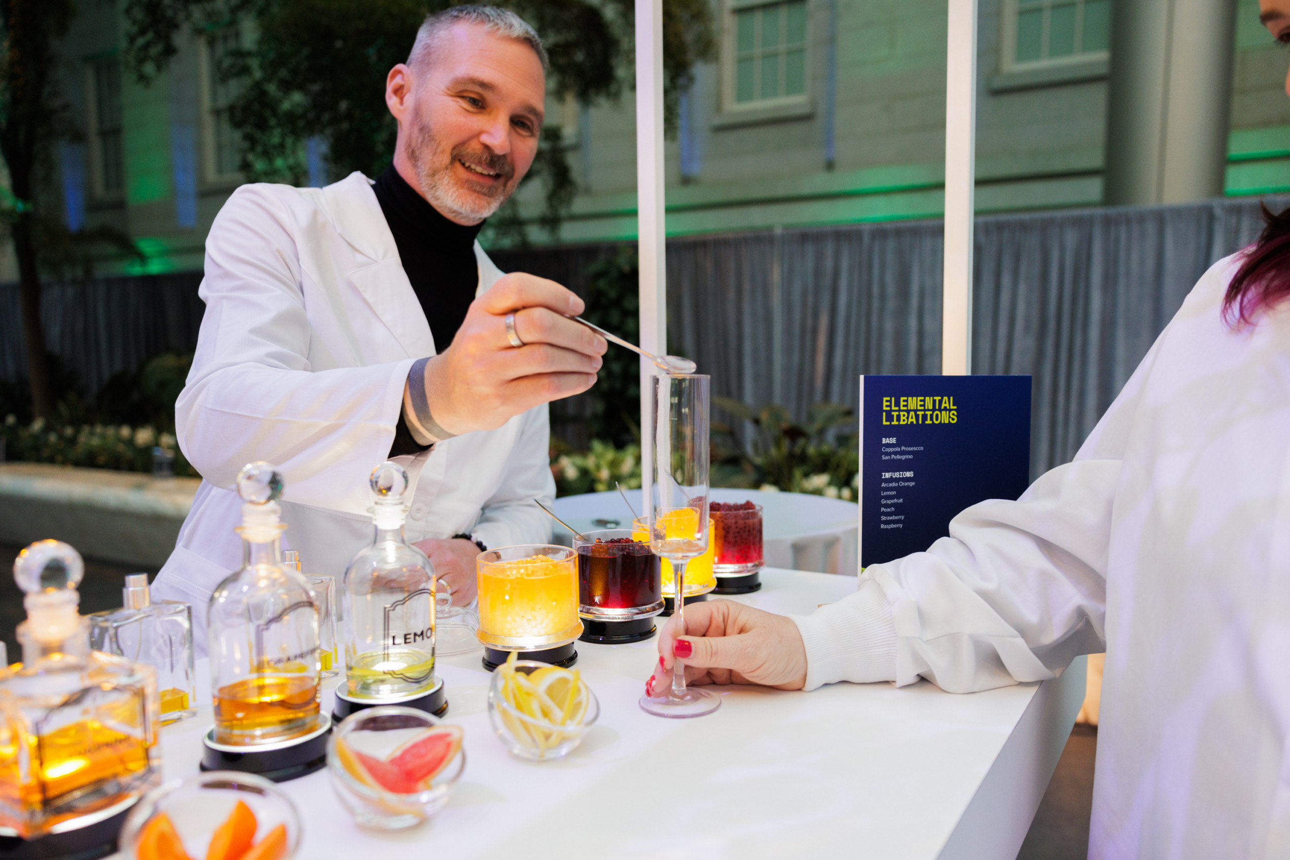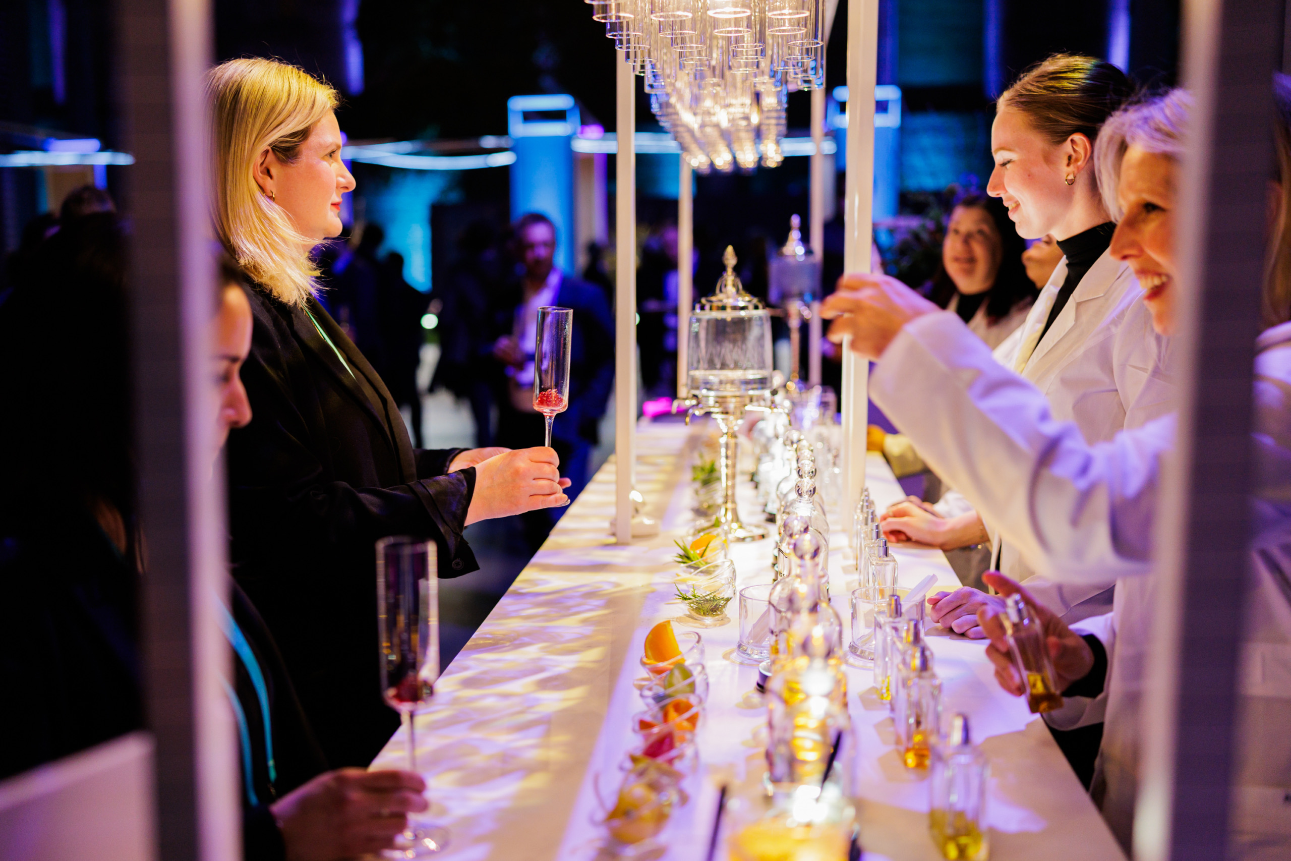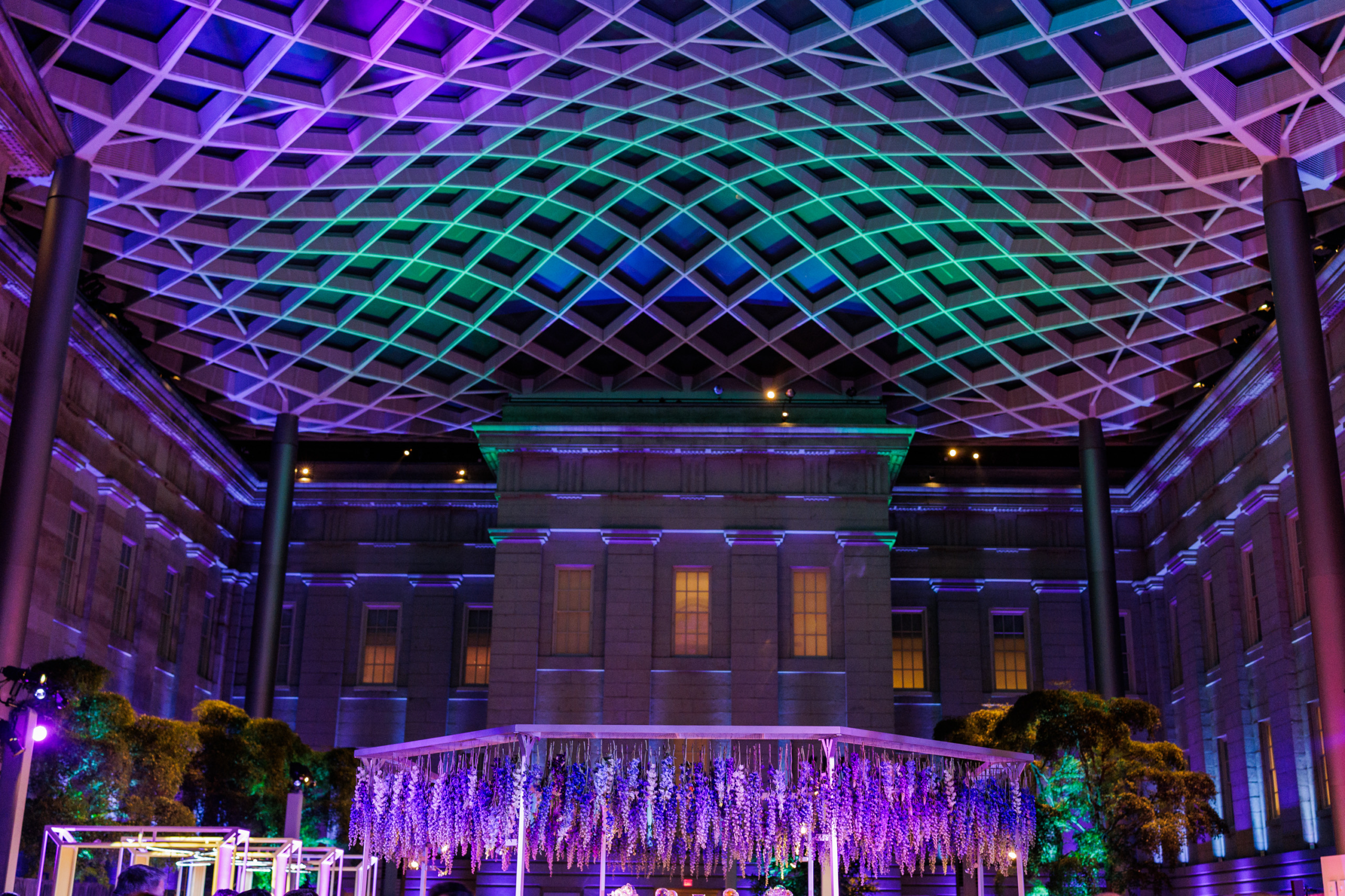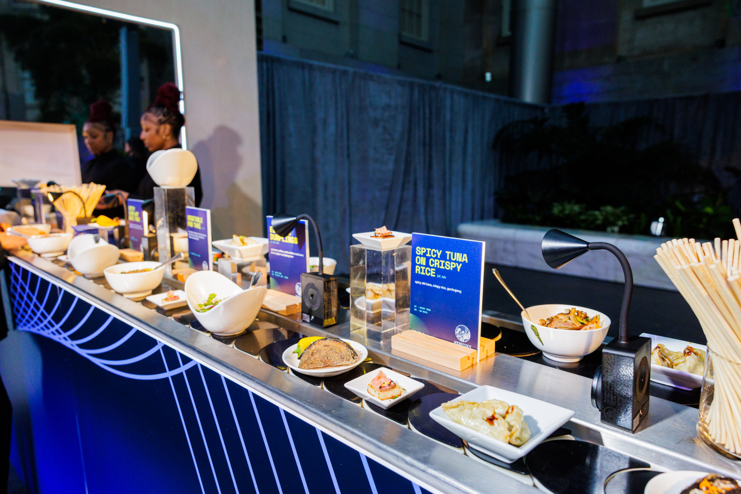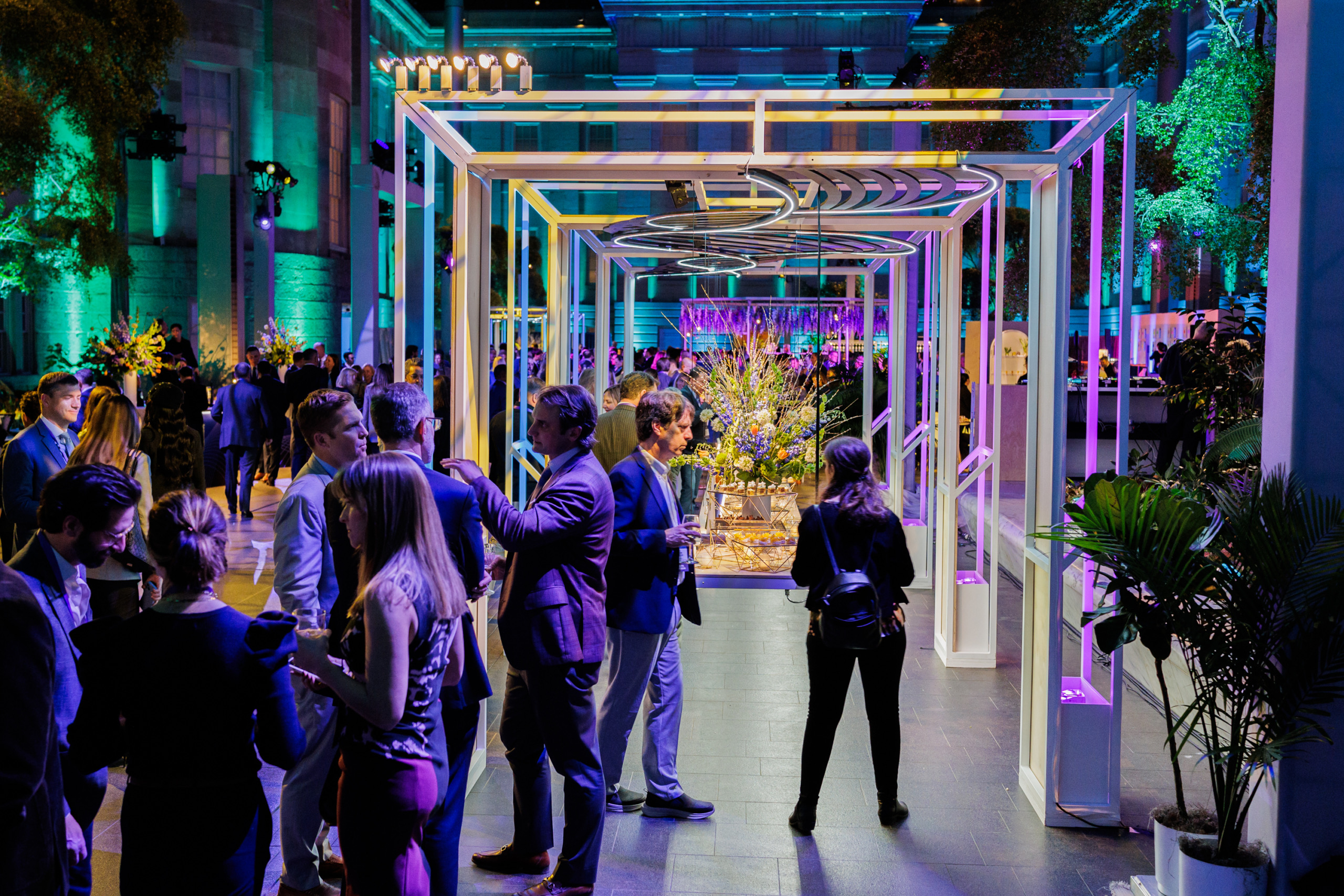The Kogod Courtyard was transformed into a sleek, modern reception space featuring edgy culinary moments and bold design. Guests mingled around a 30-foot floating buffet, created custom popsicles, and sampled bespoke champagne flavors, while a hexagon-shaped mirrored bar with a lush floral installation overhead anchored the evening in style.