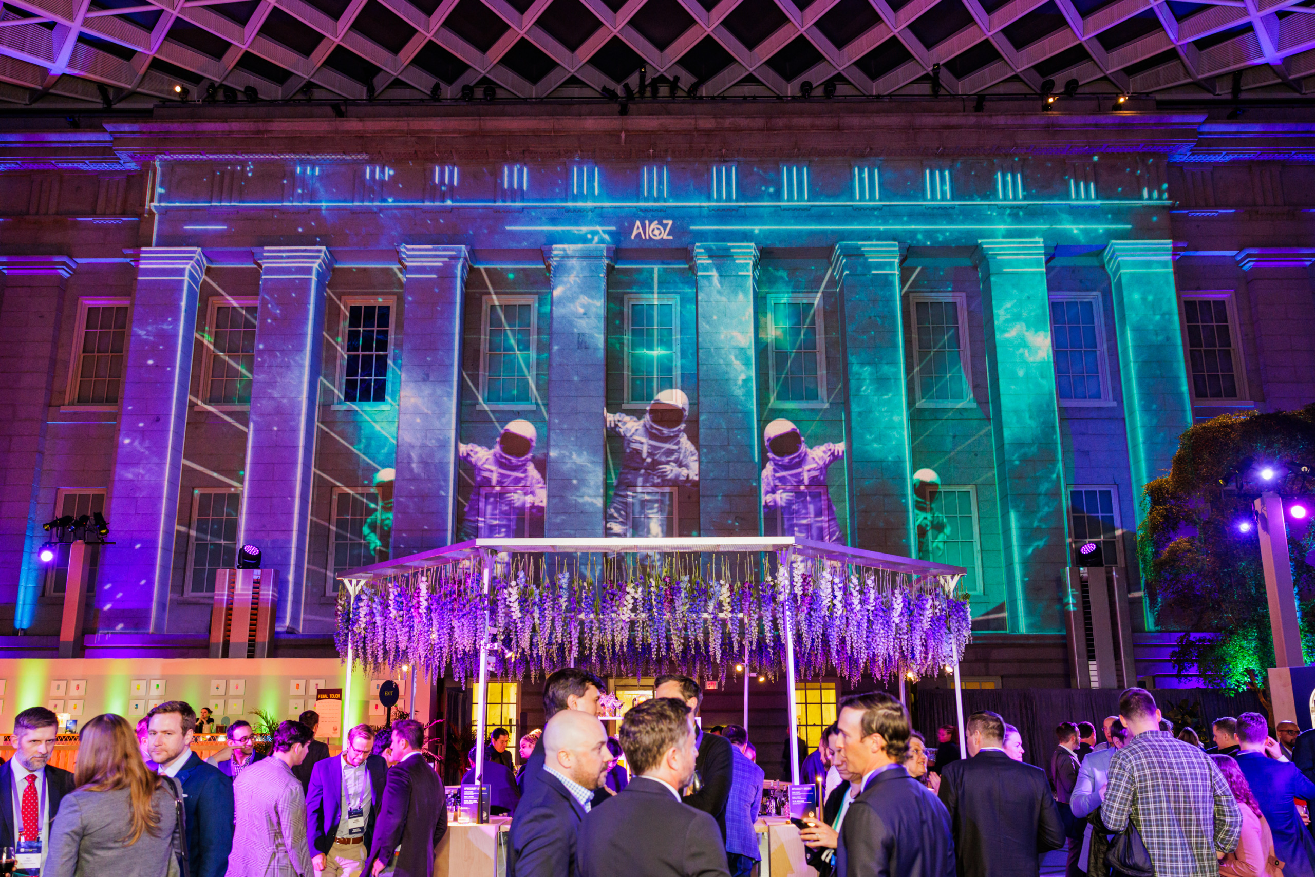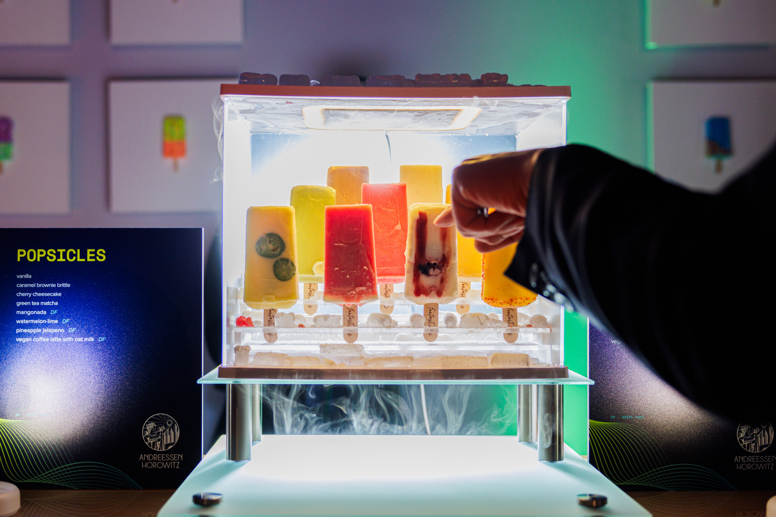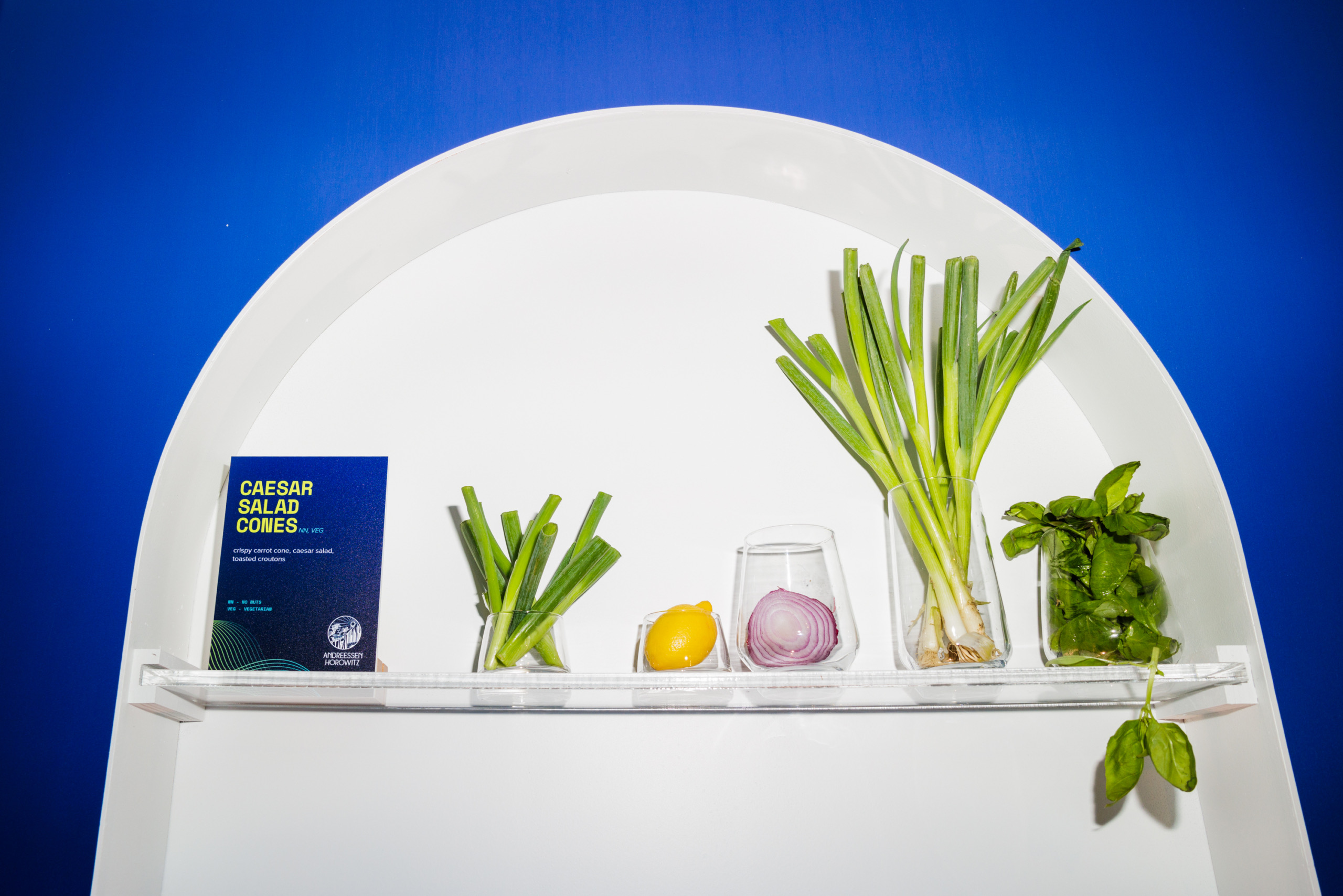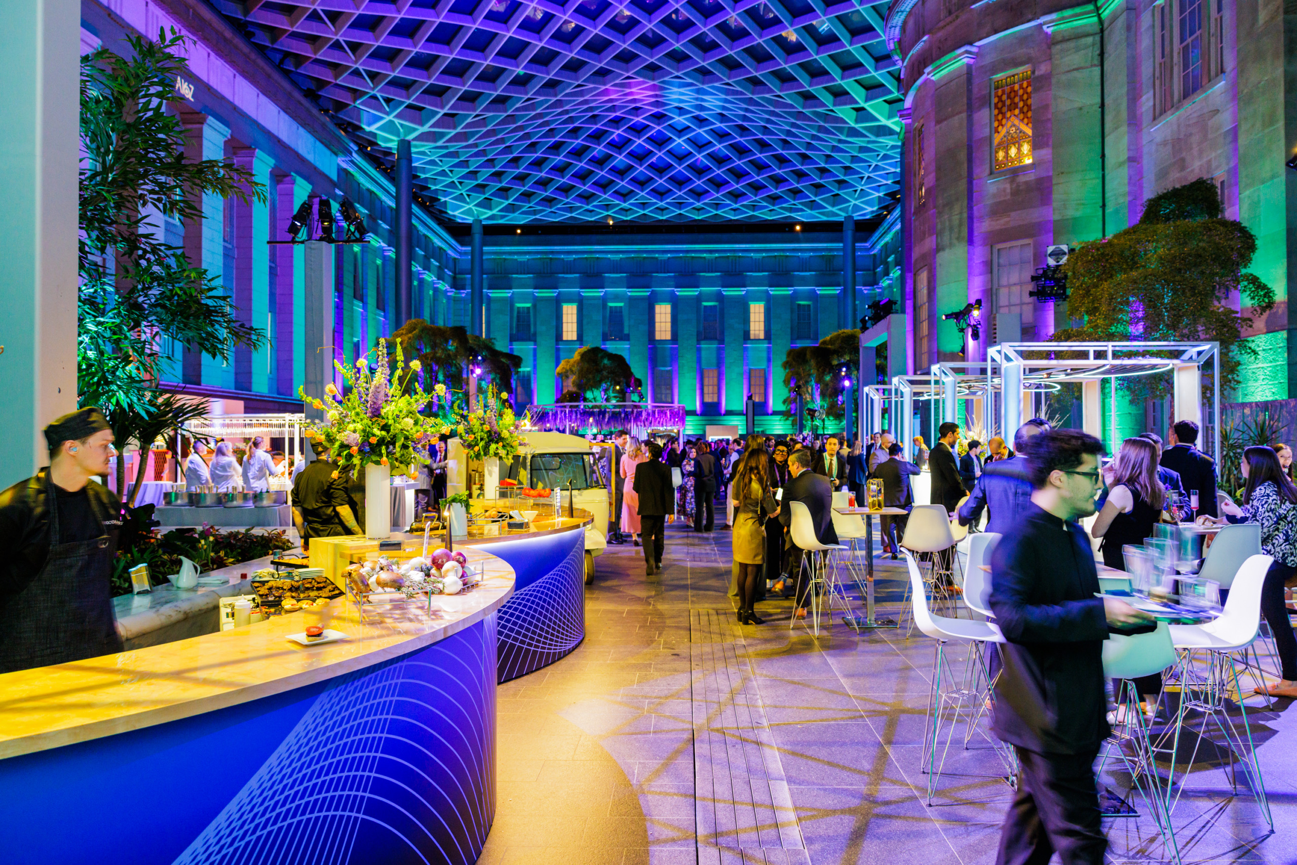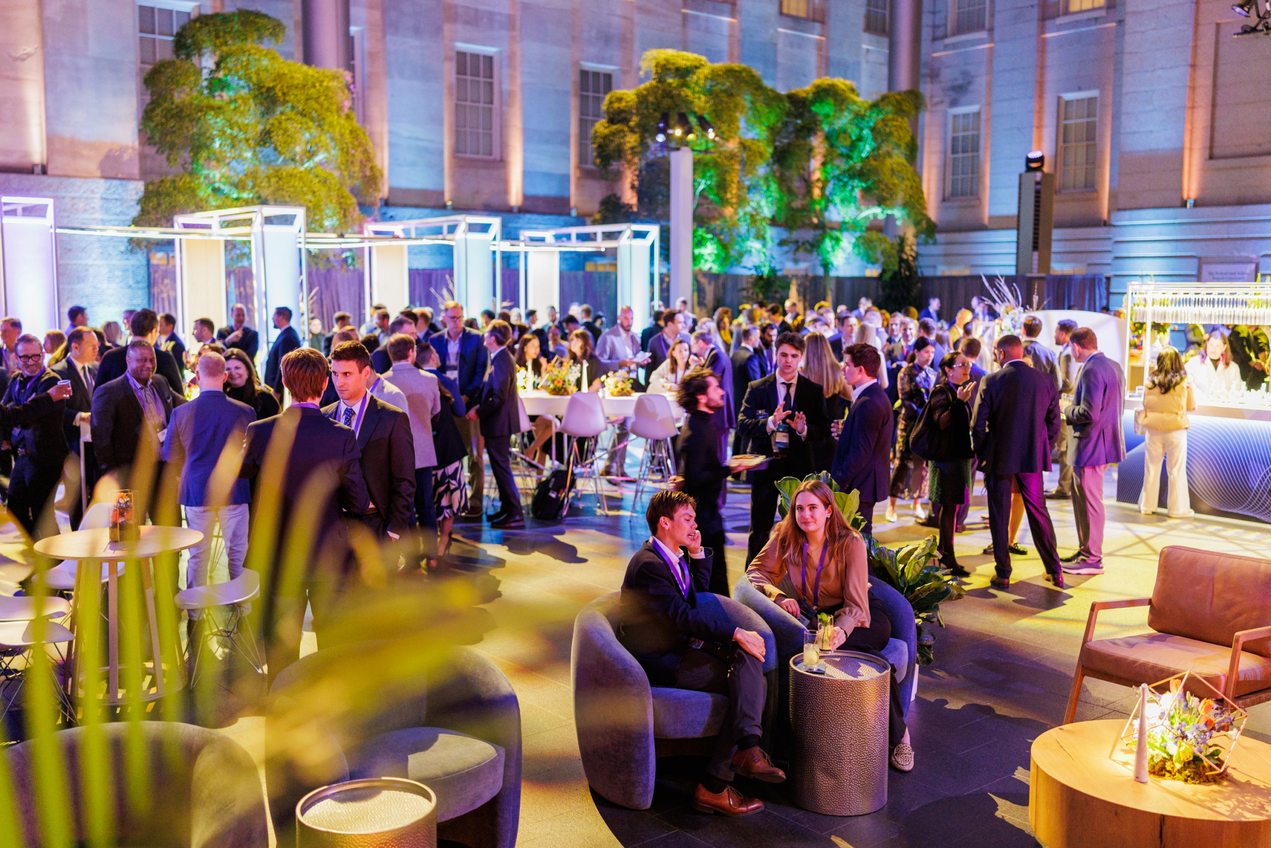 The Kogod Courtyard was transformed into a sleek, modern reception space featuring edgy culinary moments and bold design. Guests mingled around a 30-foot floating buffet, created custom popsicles, and sampled bespoke champagne flavors, while a hexagon-shaped mirrored bar with a lush floral installation overhead anchored the evening in style.