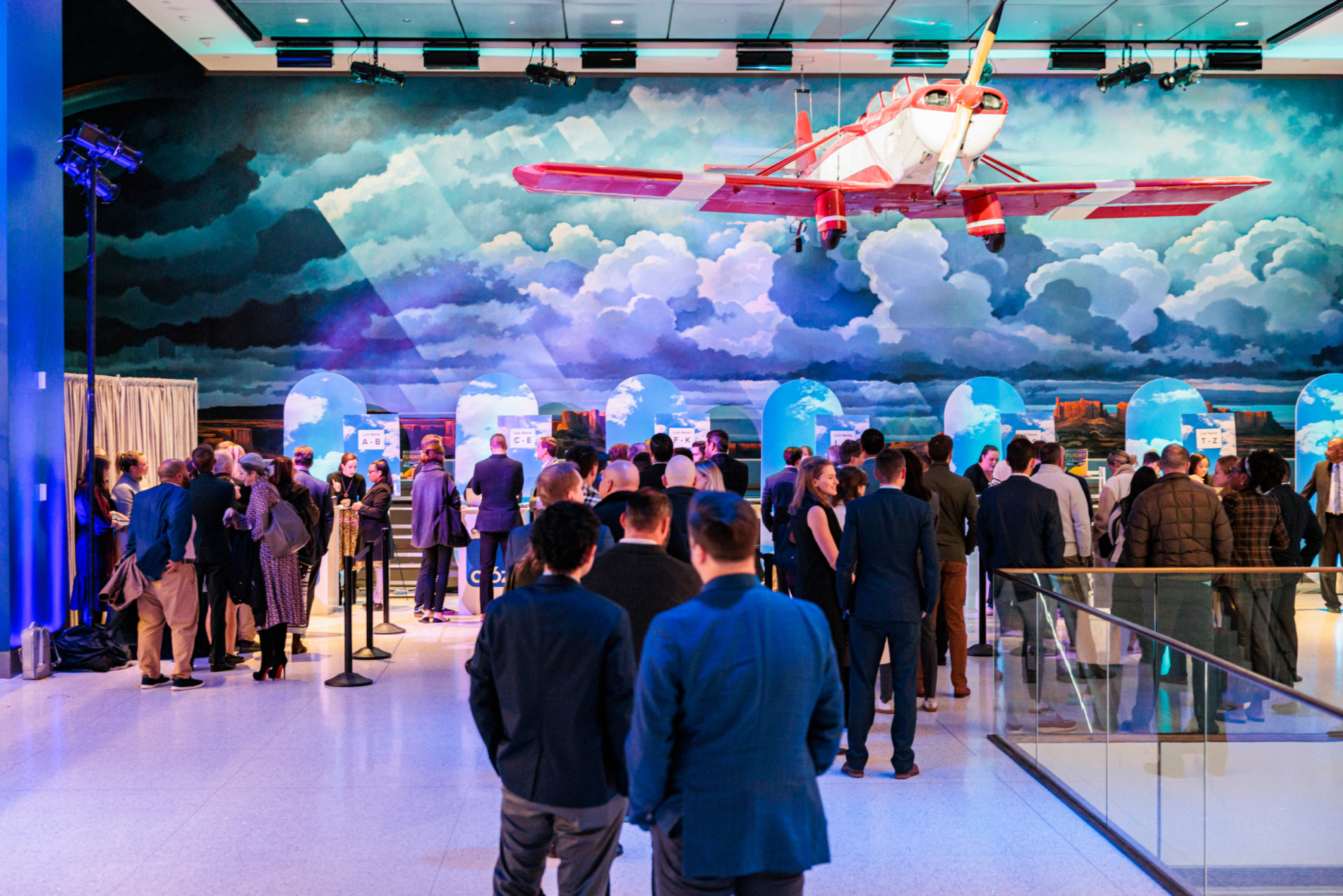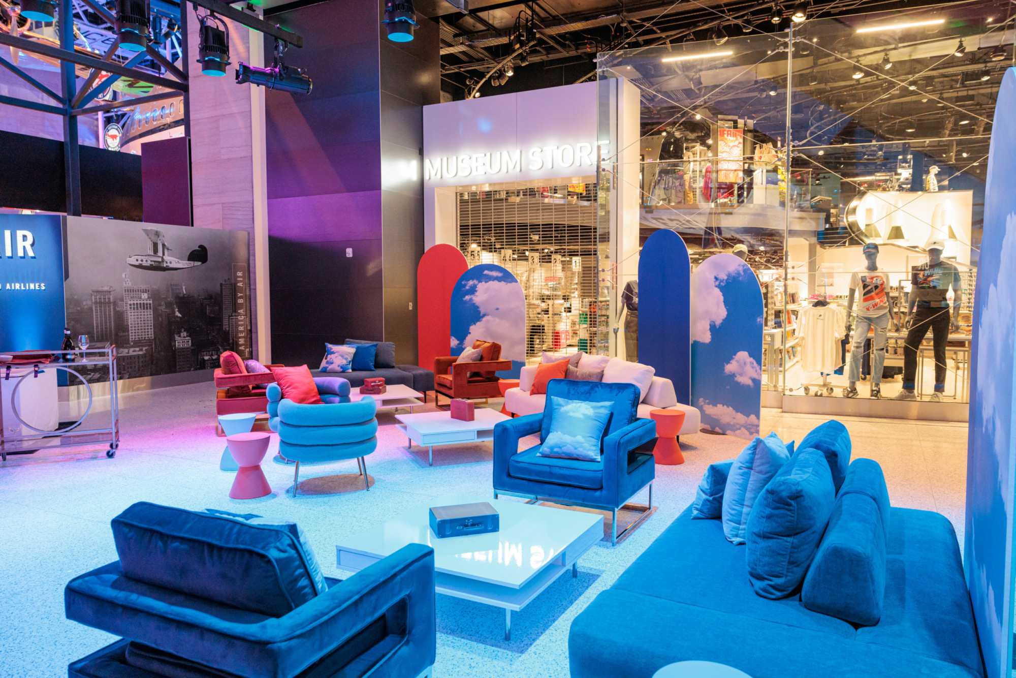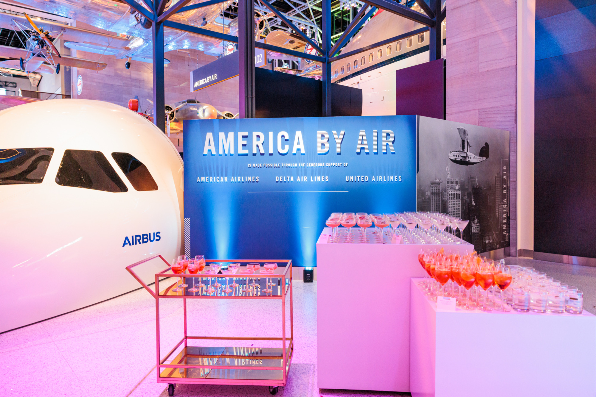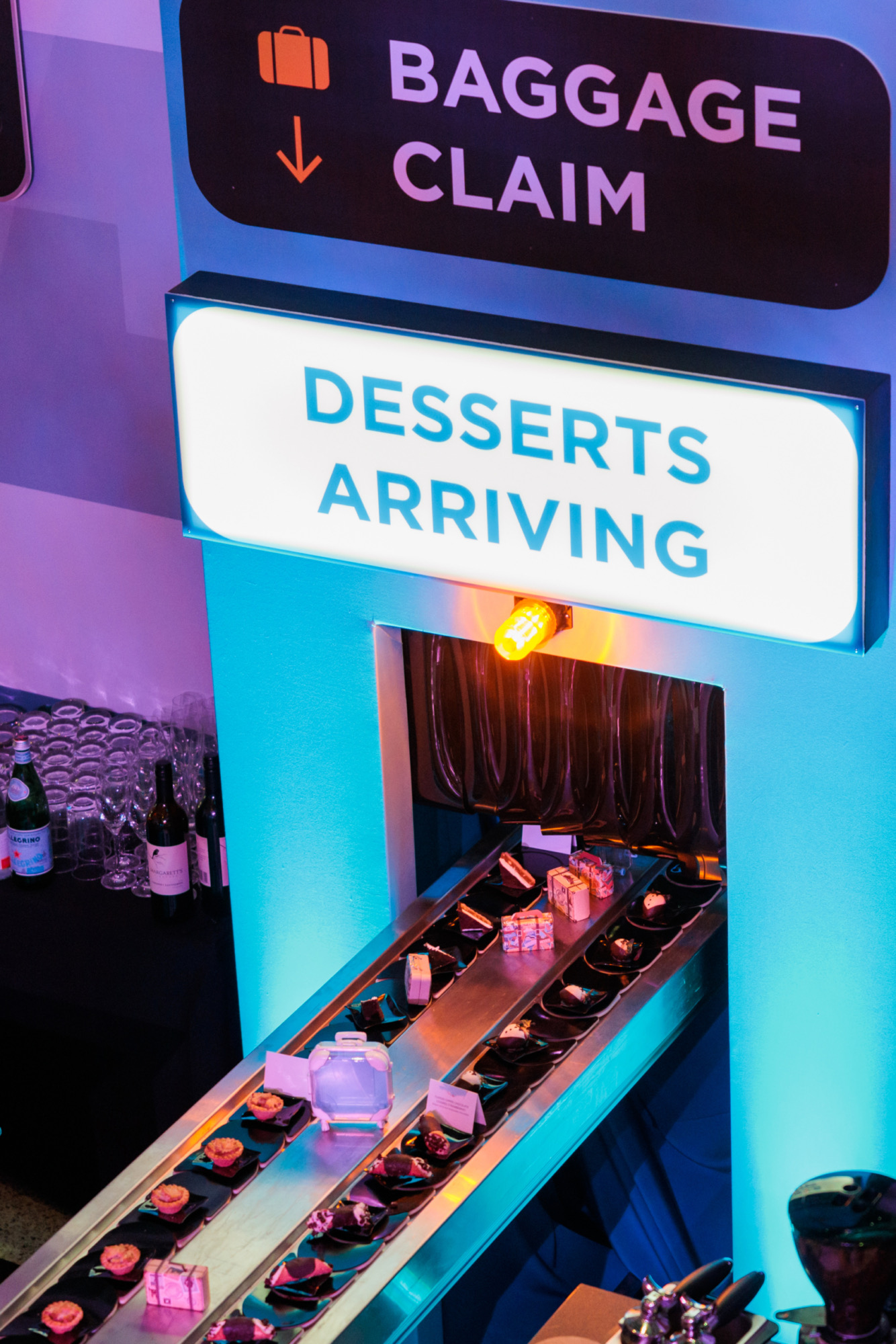 This reception took flight with imaginative details at every turn—airplane window bars, a “America by Air” lounge framed with cloudy sky backdrops, and the showstopper: a luggage carousel dessert bar. Complete with glowing signage and rotating conveyor belts carrying miniature suitcase treats, the experience soared above and beyond expectations.