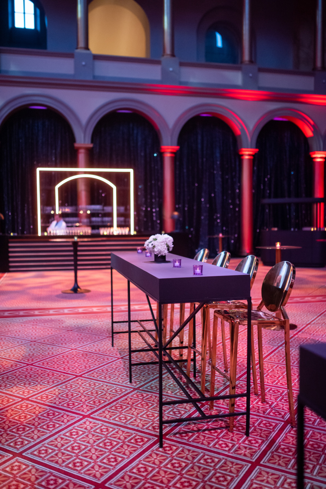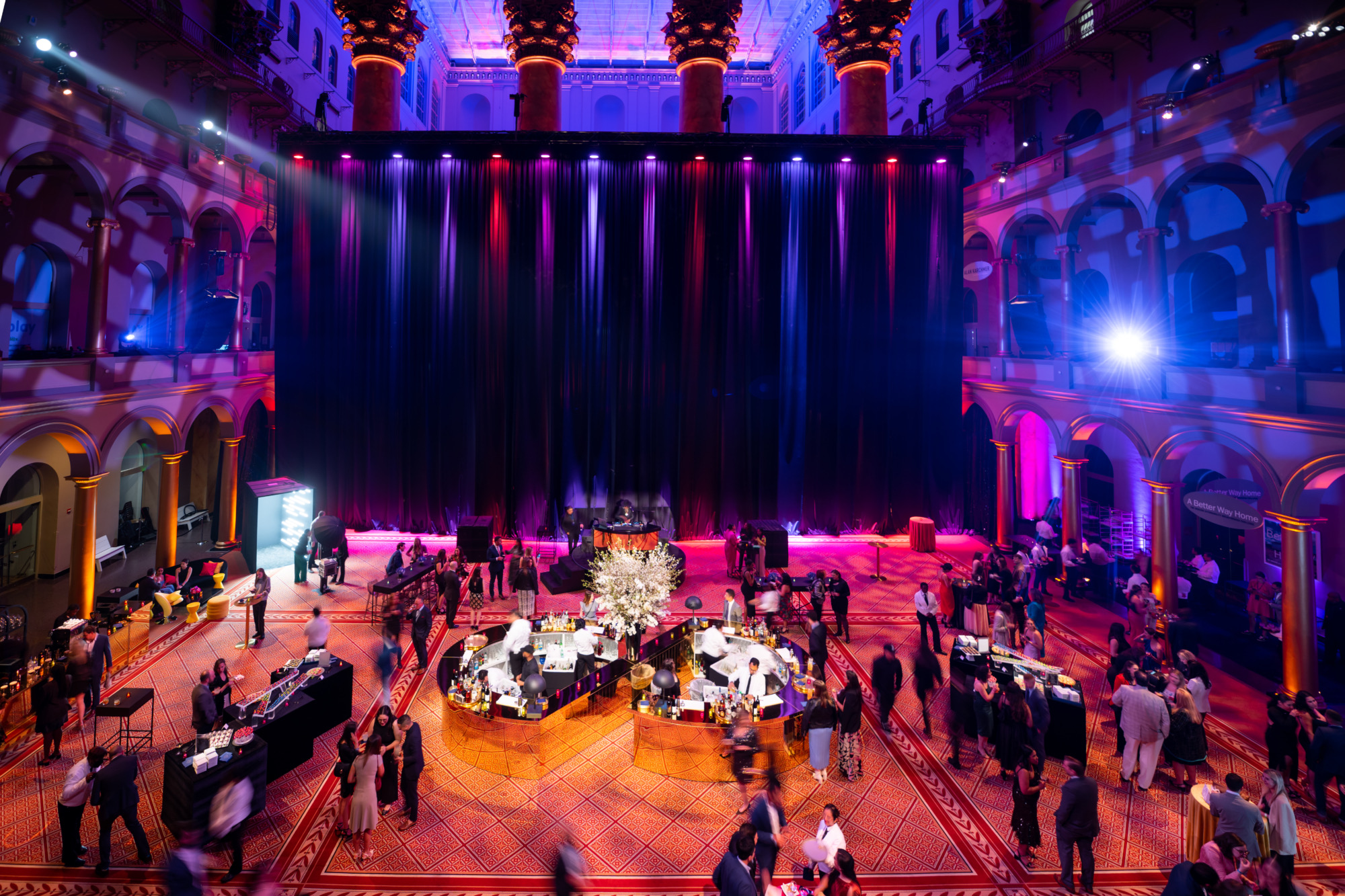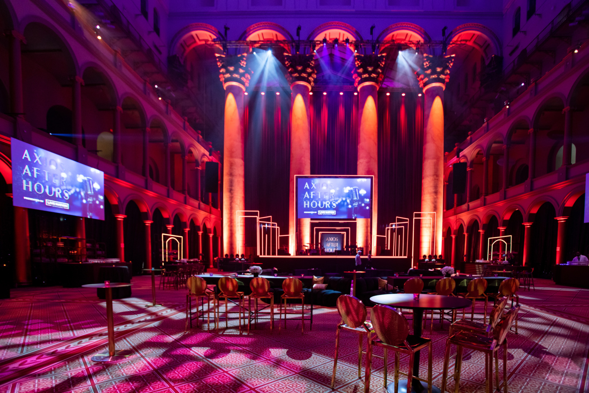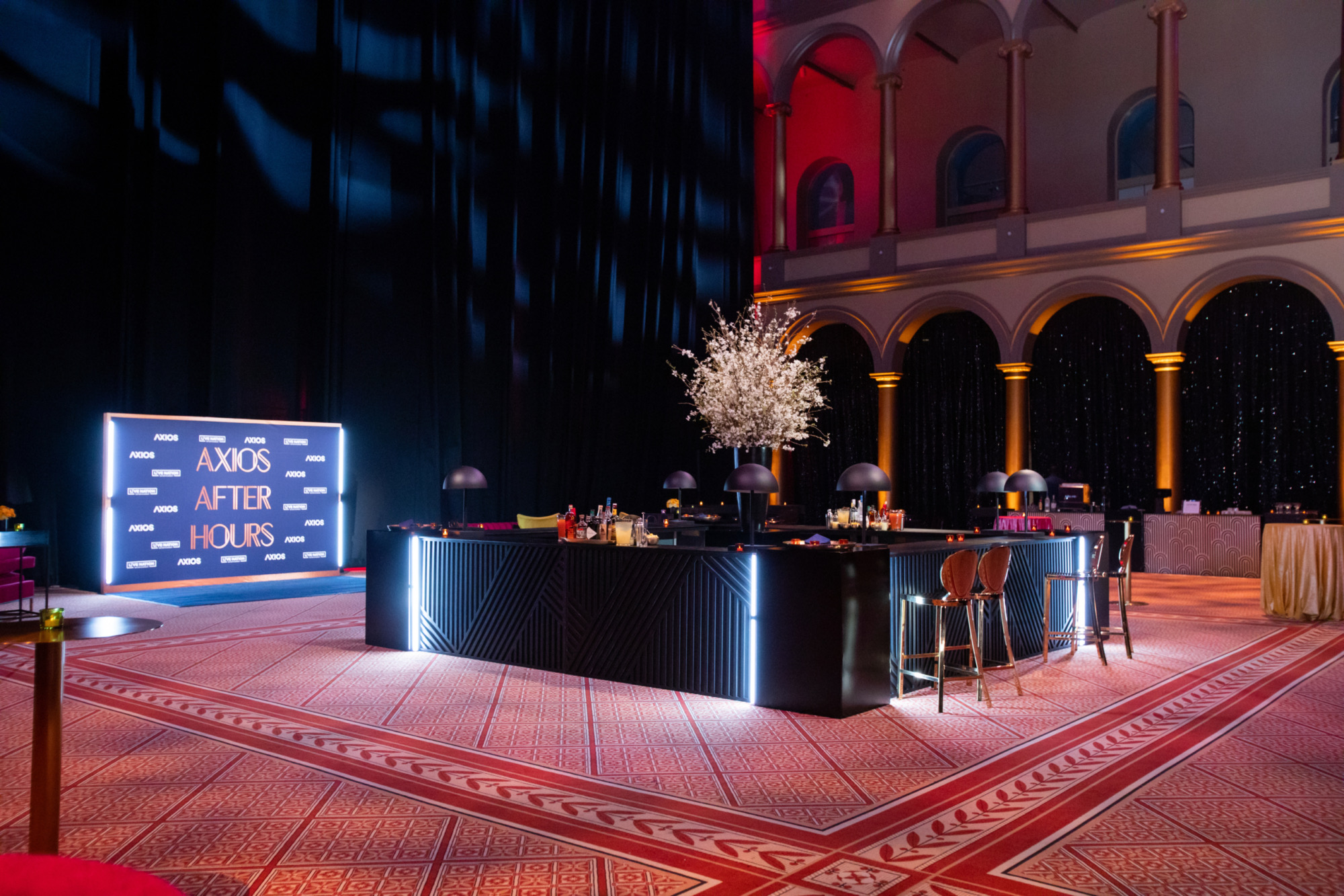 Partnering with Dufour Collaborative, we transformed the National Building Museum into a dazzling stage for Axios and Live Nation’s Correspondents’ Dinner after-party. Lainey Wilson headlined the night, while black, gold, silver, and neon accents set the scene for an unforgettable celebration that mixed Washington prestige with high-voltage performance energy.