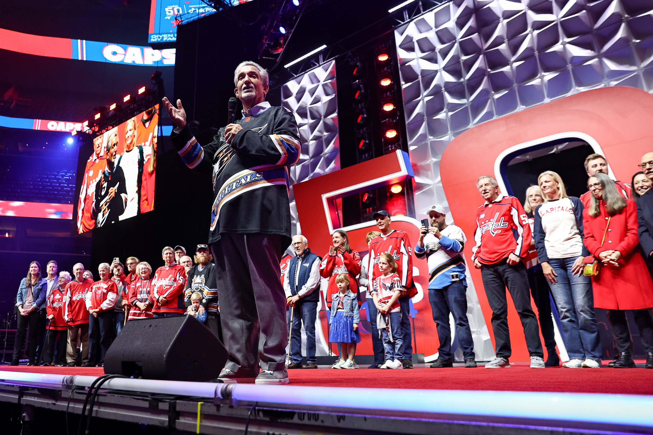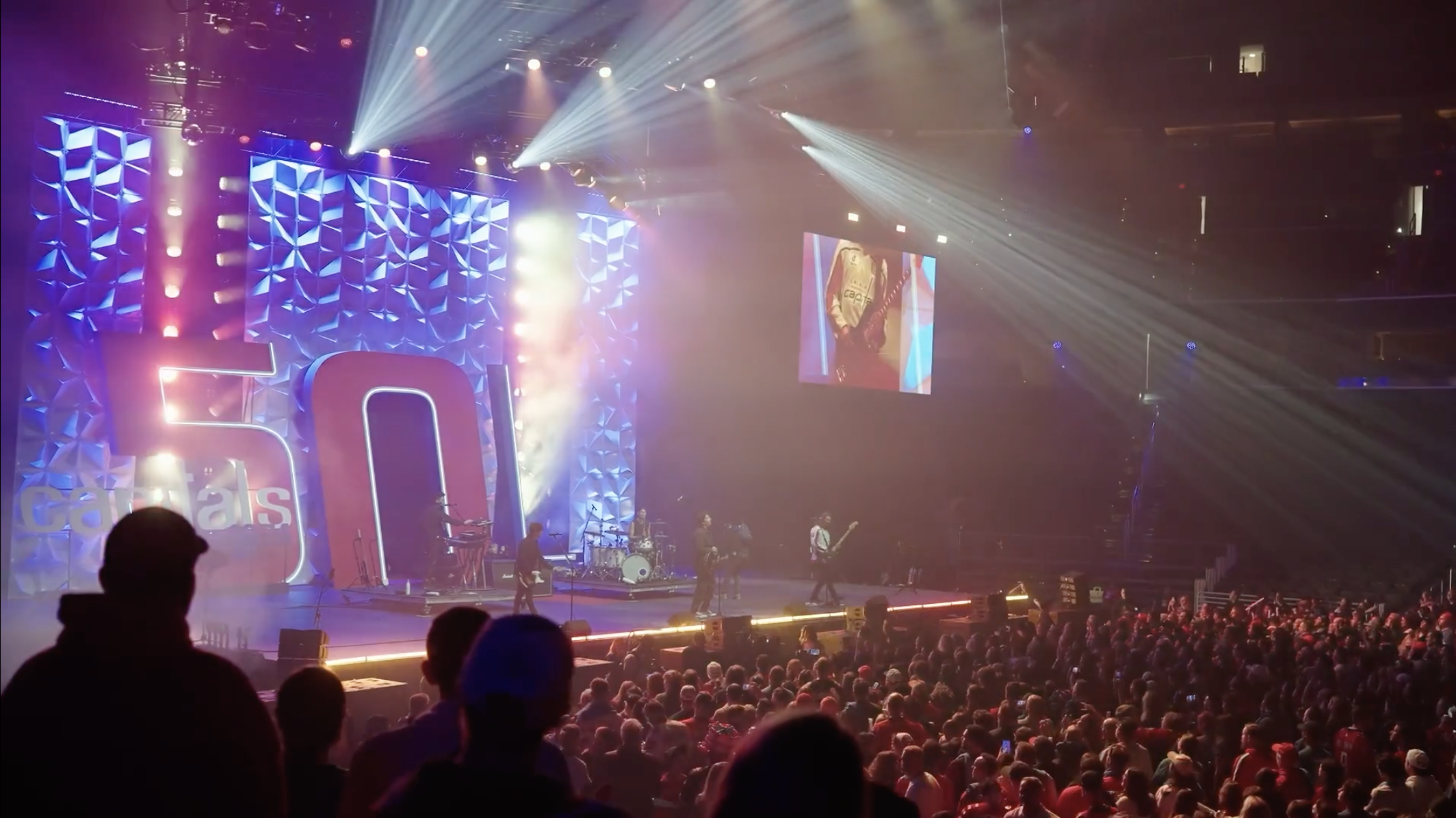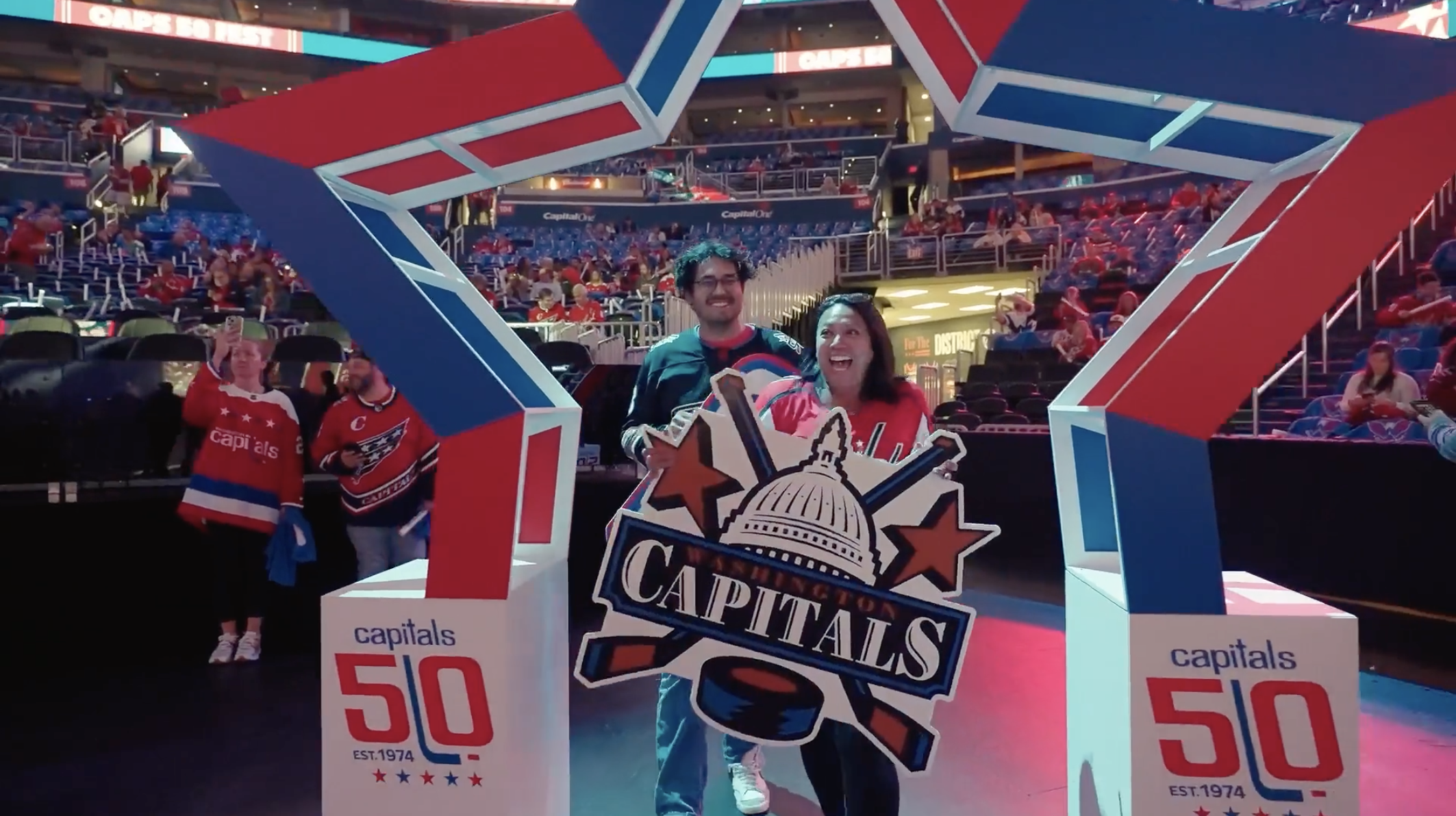 To celebrate the Capitals’ 50th anniversary, the arena came alive with an immersive fan experience. Guests entered through a bold branded arch and explored photo ops and interactive activations throughout the concourse. The night culminated on stage beneath a 20-foot “50” and Caps logo, where past and current players joined the celebration before a high-energy concert by Third Eye Blind.