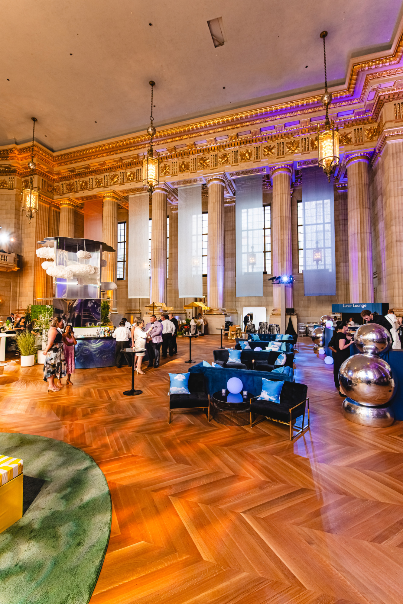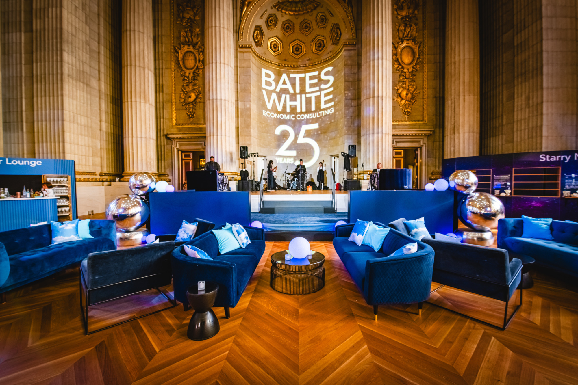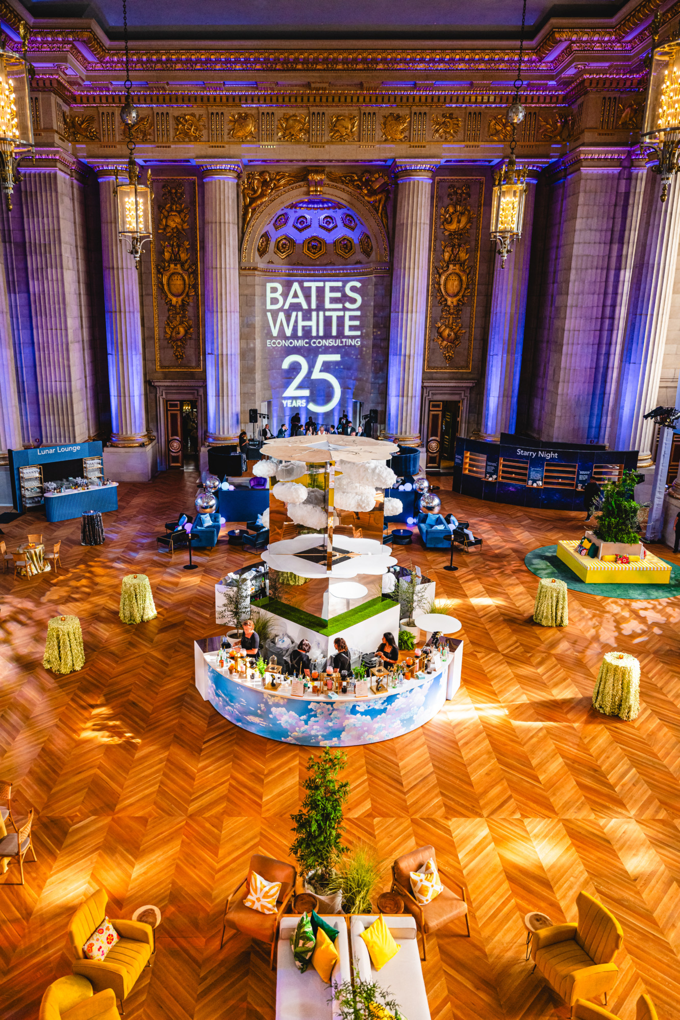 To celebrate 25 years of Bates White Economic Consulting, the Mellon Auditorium was transformed into a bright, creative, and delightfully quirky setting. Stripes, greenery, and cloud-inspired décor framed playful food stations and seating, with a design that shifted from day to night—mirroring the firm’s journey while keeping the celebration vibrant and full of surprise.