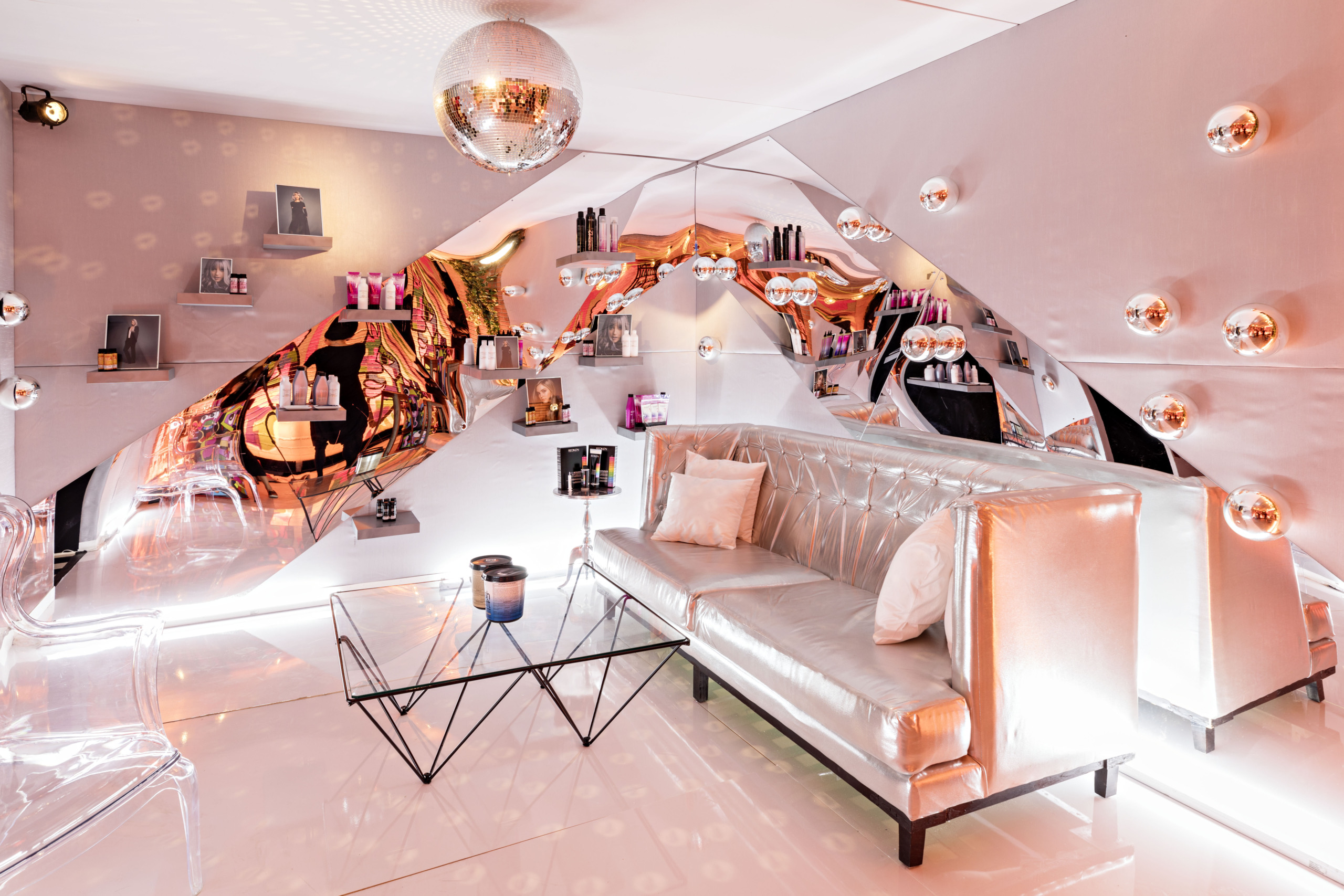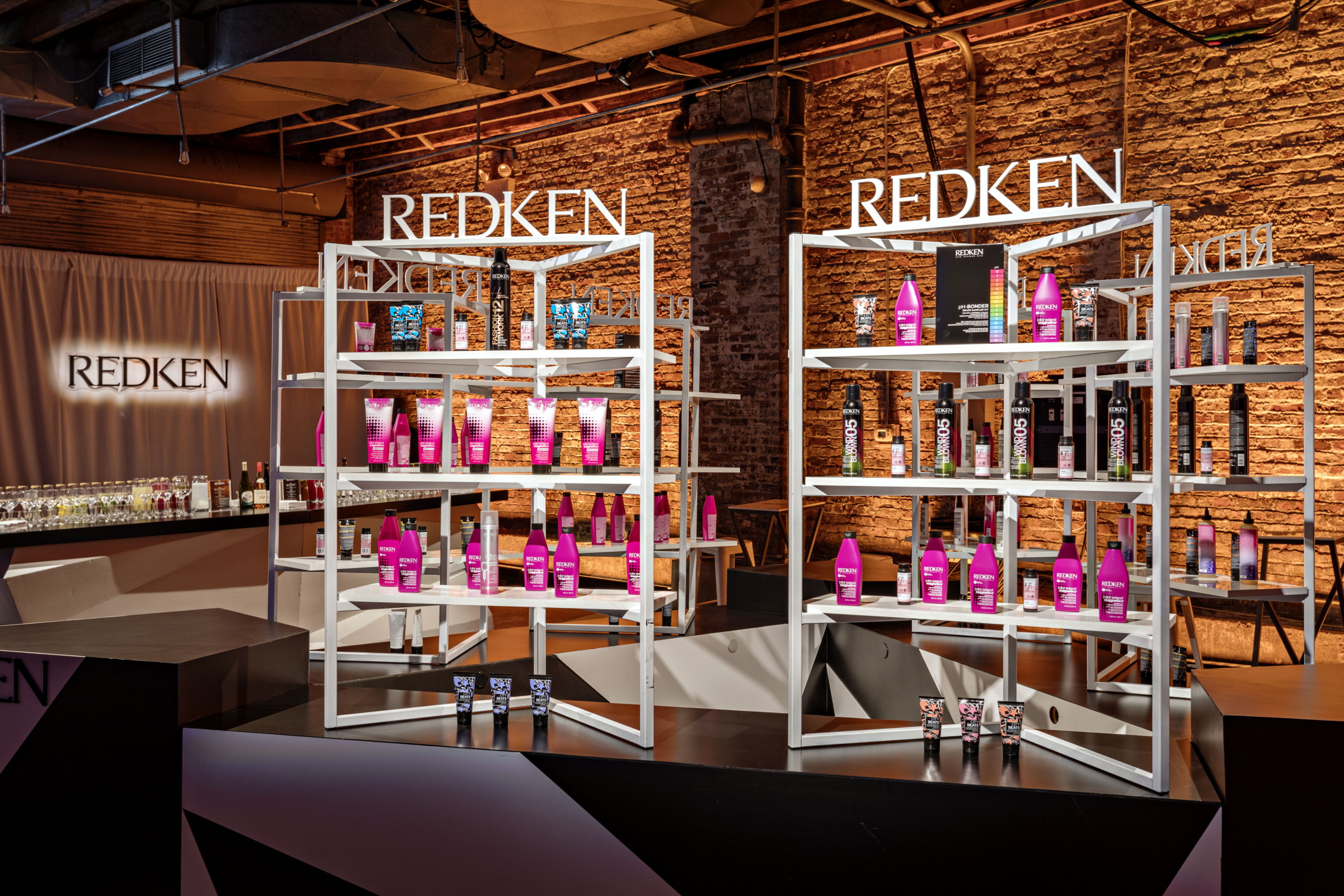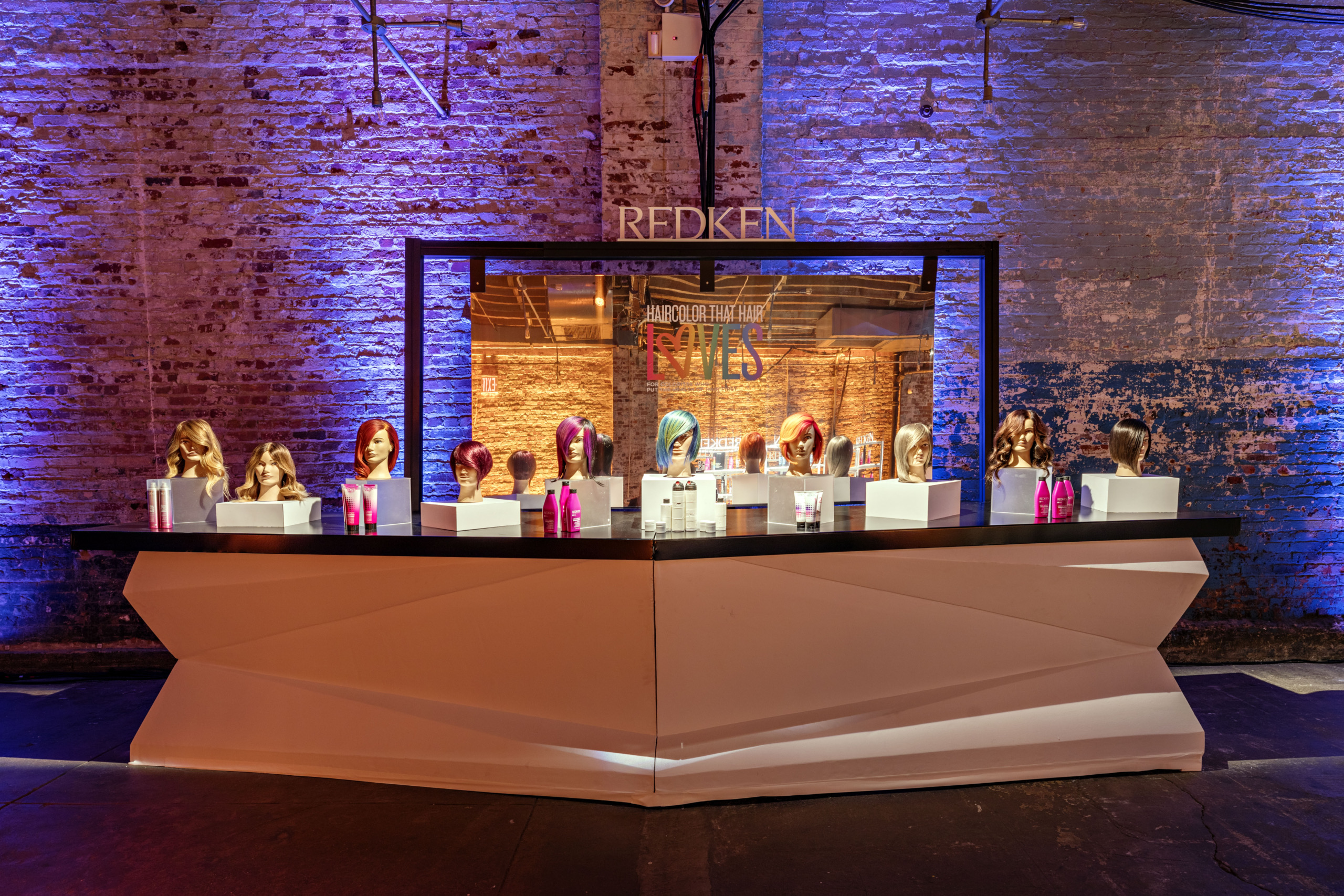 An empty event space was transformed into a vibrant pop-up where guests journeyed room to room, each inspired by a different Redken shade. From blonde to brunette, silver to black, every hair color had its own immersive home—turning the brand’s iconic line into a full-spectrum experience.