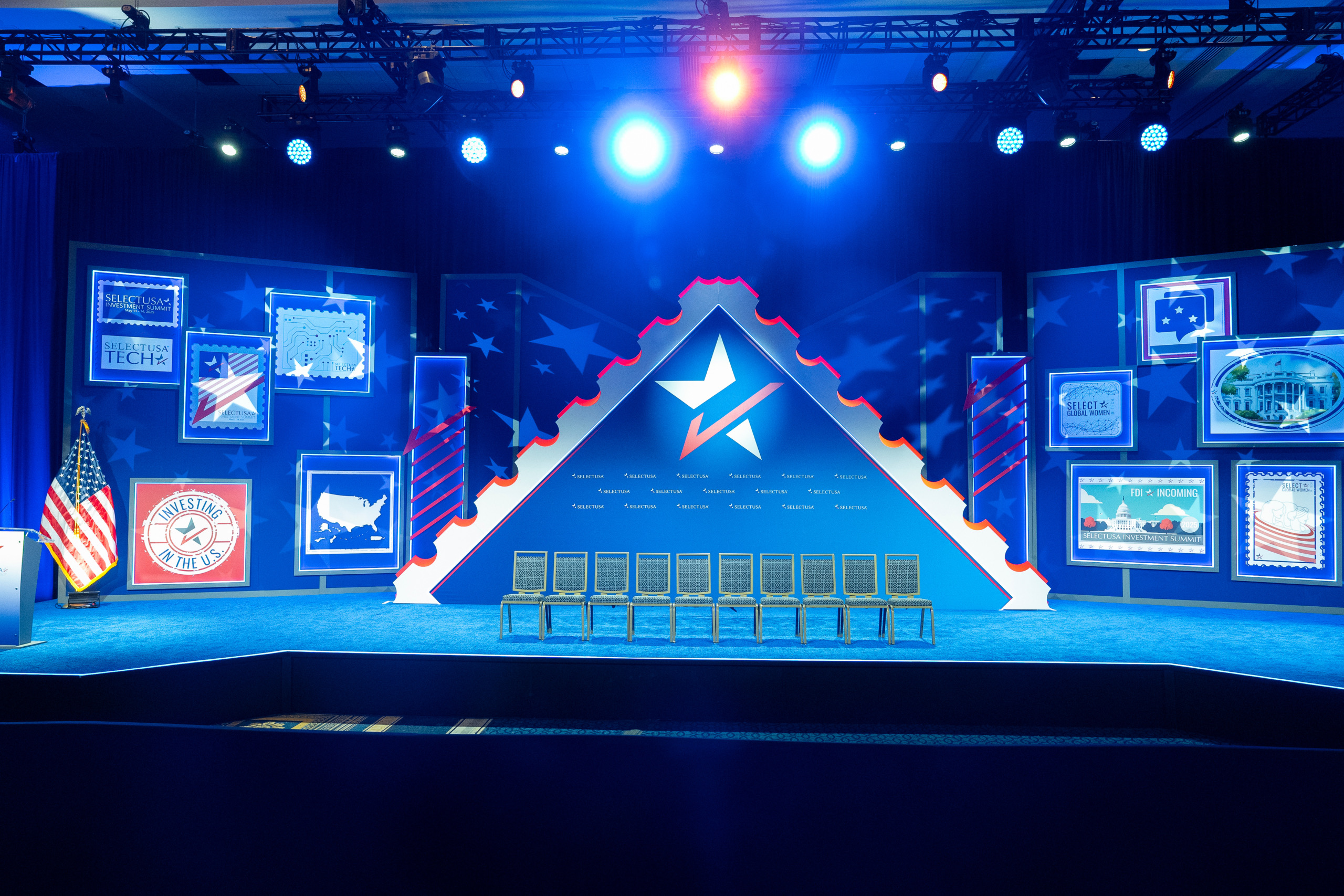 Produced by Event Power at the Gaylord National, the SelectUSA Conference brought together global business leaders with a dynamic stage set and expansive exhibit hall. A bold map-inspired design anchored the event, reflecting the conference’s mission of connecting companies with opportunities across the United States.